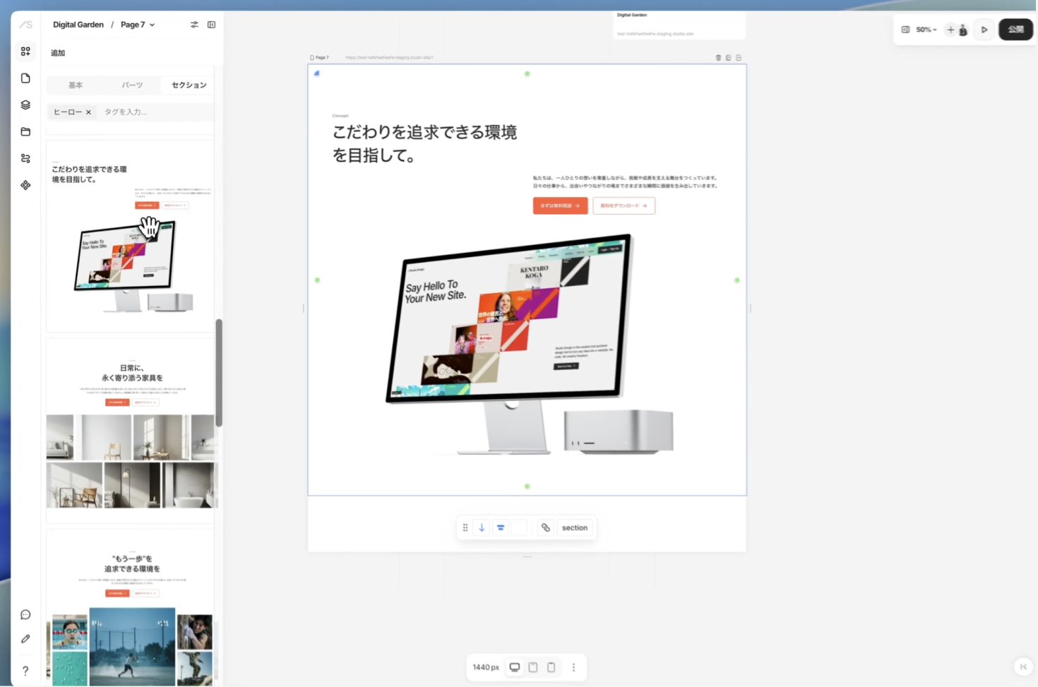テンプレートやプリセットセクションがあり、プロ向けの詳細なプロパティやカスタムフォントも使える。しかも、同じ構造で一貫して動く。ここがStudioの良さだと捉えています。