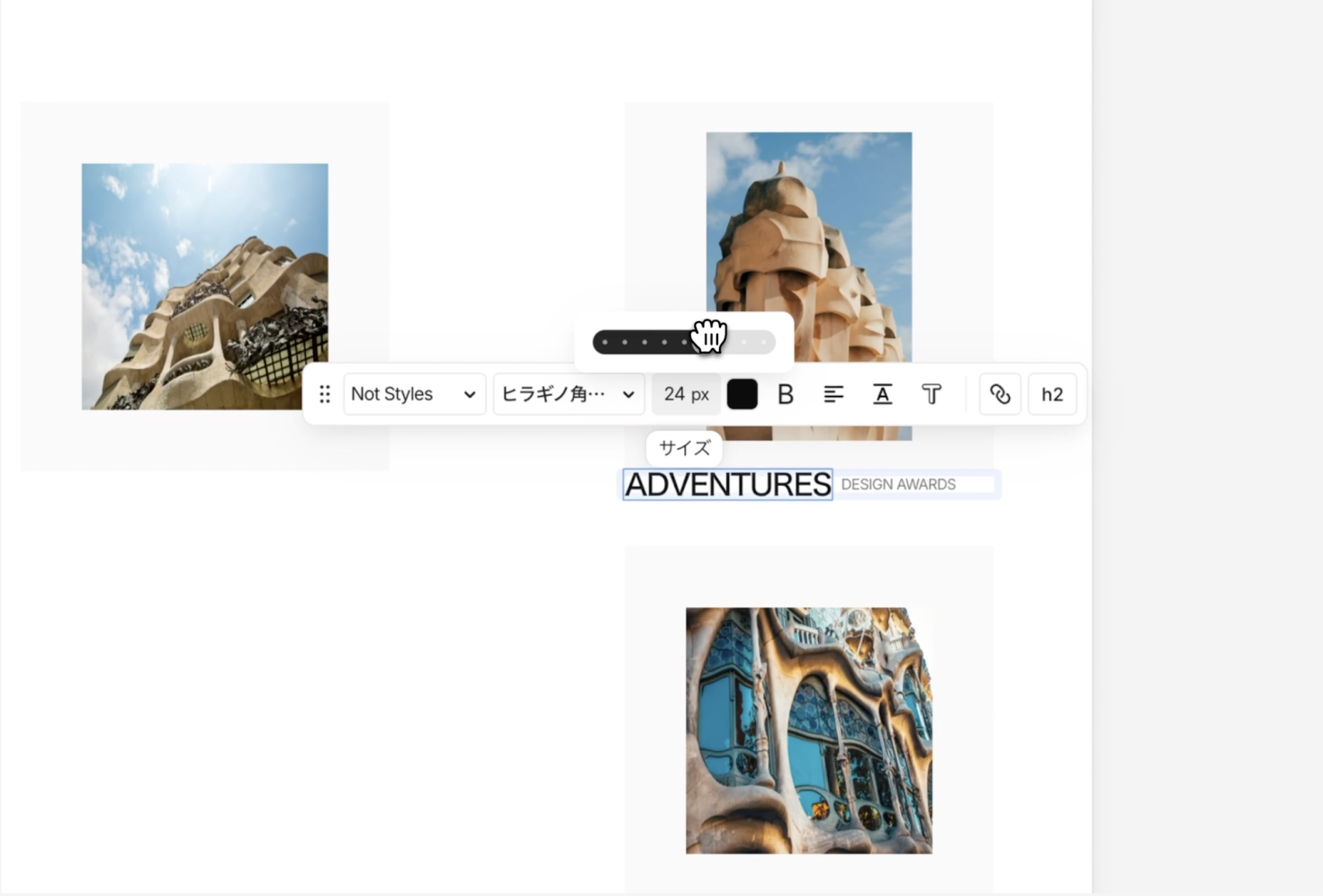 2つ目が、パネル上での簡易なデザインの調整機能「Quick Bar」です。各パーツを選択すると、パネル上でカラーやフォントサイズ、余白などの基本的なデザイン要素を直感的に変更できます。Figmaのようなデザインツールの経験がなくても調整しやすくなり、自由度と効率性が同時に向上しました。